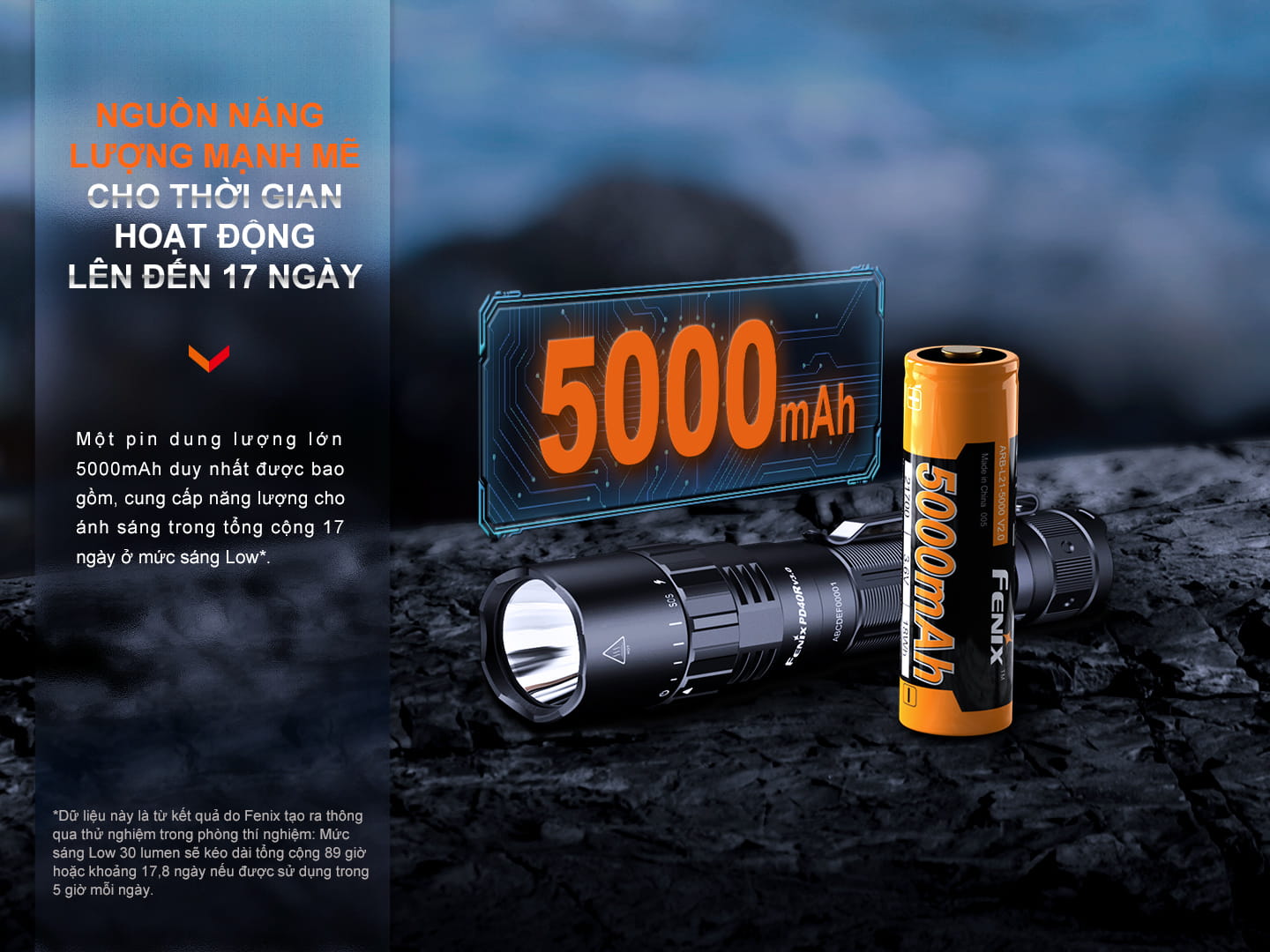 Đèn sử dụng 1 viên pin sạc Li-ion 21700 dung lượng 5000mAh, cho thời lượng sáng liên tục tối đa 89 giờ chỉ trong 1 lần sạc. Cổng sạc Type C được tích hợp trực tiếp ngay trên thân đèn, với led báo mức pin bên cạnh, hiển thị trực quan và dễ nhận diện.
