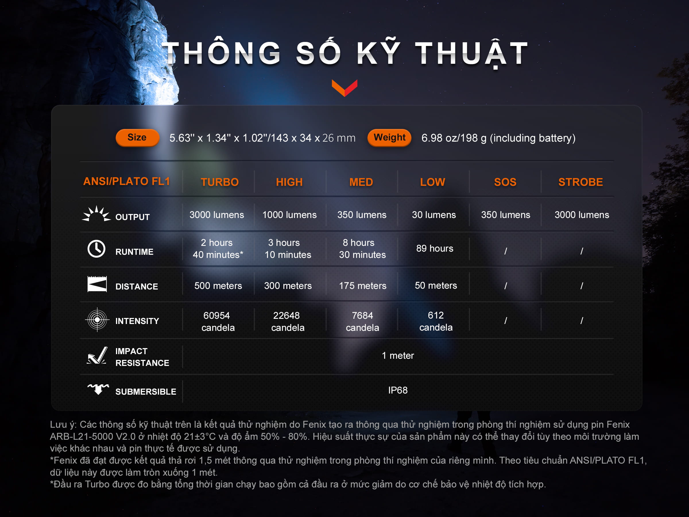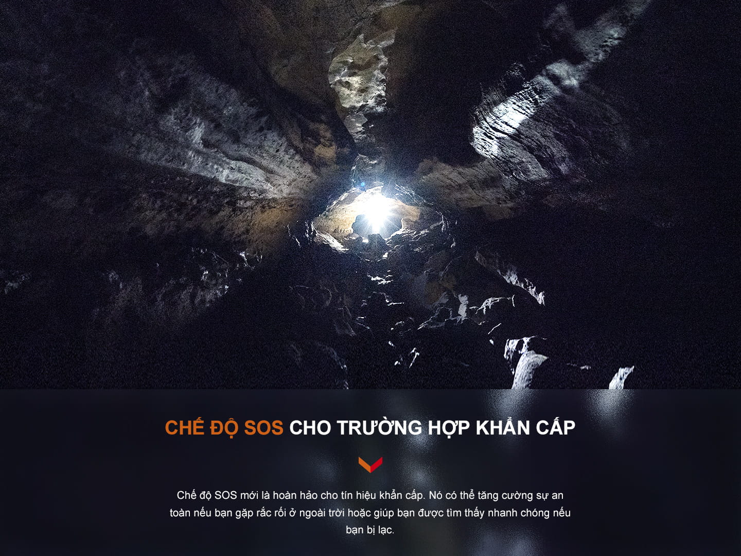Fenix PD40R V3.0 có tổng cộng 4 mức sáng trải rộng từ Low 30 lumens đến Turbo 3000 lumens. Đèn còn có thêm 2 chế độ Strobe và SOS. Đây là chế độ sáng rất hữu ích trong nhiều trường hợp khẩn cần phát tín hiệu, nhất là các yêu cầu đặc chủng, để cảnh báo và trấn áp đối tượng.