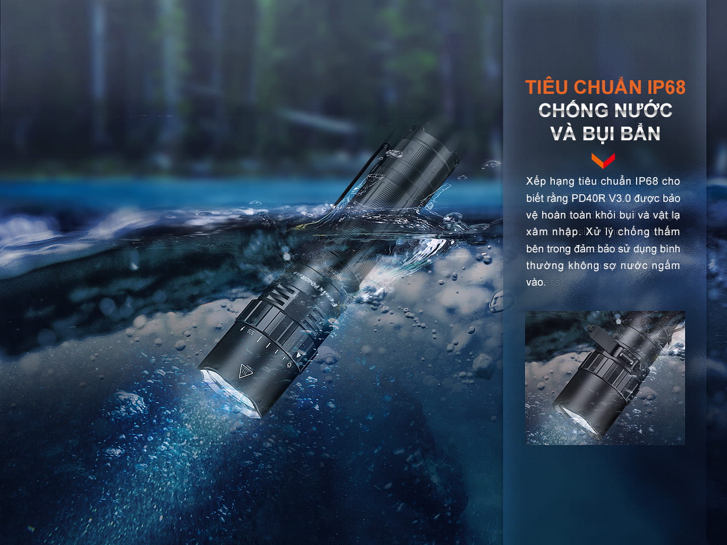 Thân đèn Fenix PD40R V3.0 được gia công từ hợp kim nhôm A6061-T6 siêu bền và siêu nhẹ, cho đèn khả năng chịu va đập ở độ cao tối đa 1m. Đèn còn được trang bị khả năng chống bụi, nước theo tiêu chuẩn IP68.