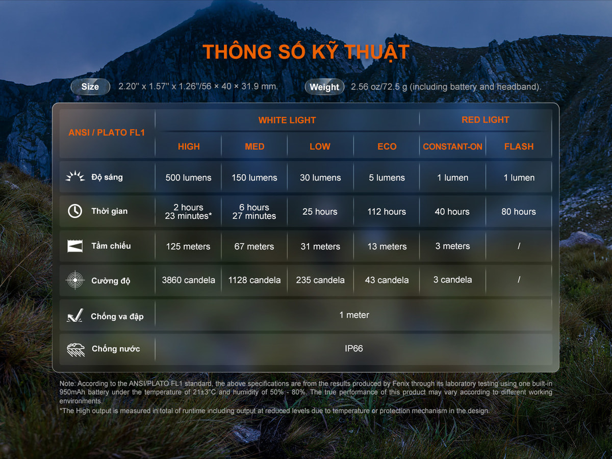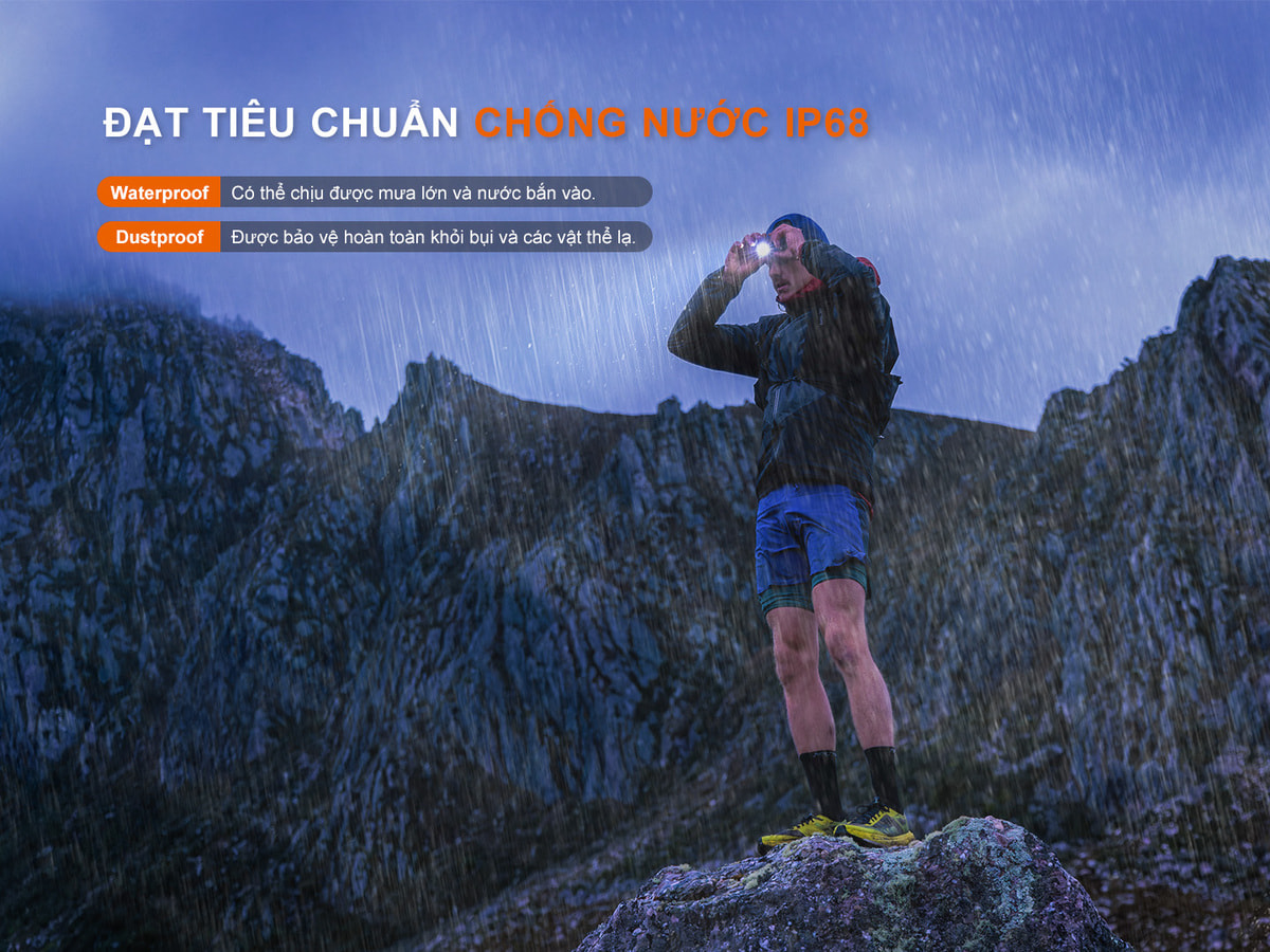 - LED trắng với công suất tối đa 500 lumens, chiếu xa 125 mét, phù hợp cho việc chạy đêm, trekking hoặc tìm đường.