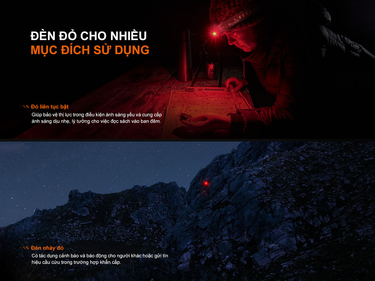 - LED đỏ công suất thấp, giúp bảo vệ thị lực ban đêm, đọc bản đồ hoặc dùng trong lều mà không làm chói mắt người khác.