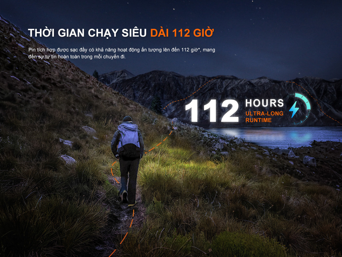 Đèn tích hợp pin sạc Li-ion 950mAh (có thể sạc lại nhanh chóng qua USB Type-C) và có 6 chế độ chiếu sáng đa dạng. Hệ thống bộ nhớ thông minh giúp đèn ghi nhớ mức sáng cuối cùng đã sử dụng, và chế độ khóa an toàn giúp tránh vô tình bật đèn khi cất trong balo.