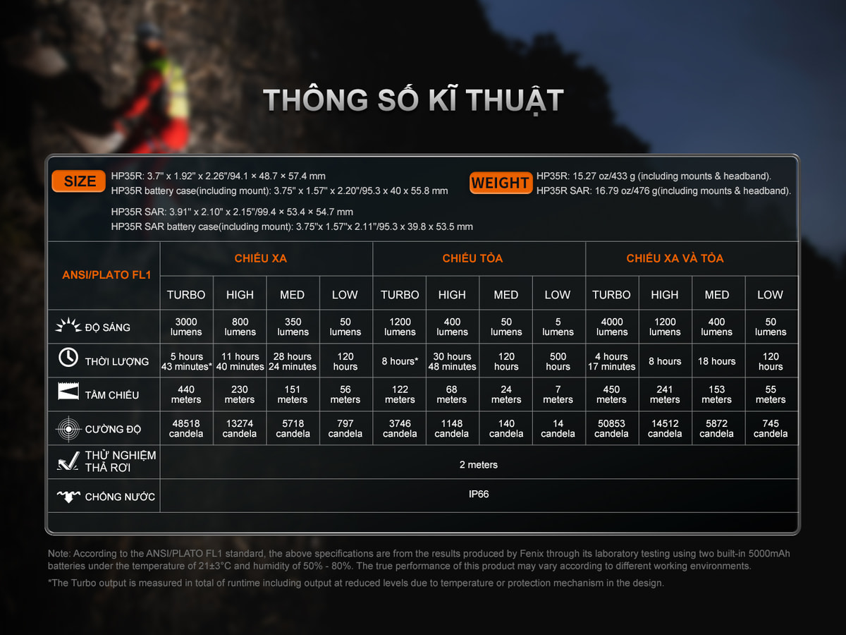 • Sáng hỗn hợp: 4000 lumens, tầm chiếu 450 mét, sáng tối đa 120 giờ.