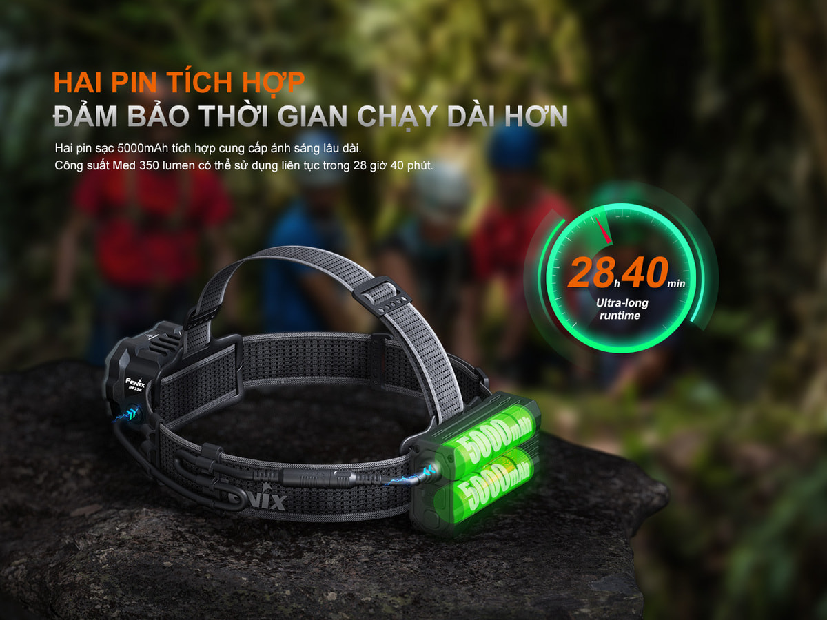 Đèn pin Fenix HP35R sử dụng 1 pack pin bố trí phía sau đầu, có nguồn 7.2 vol và dung lượng 5000mAh.