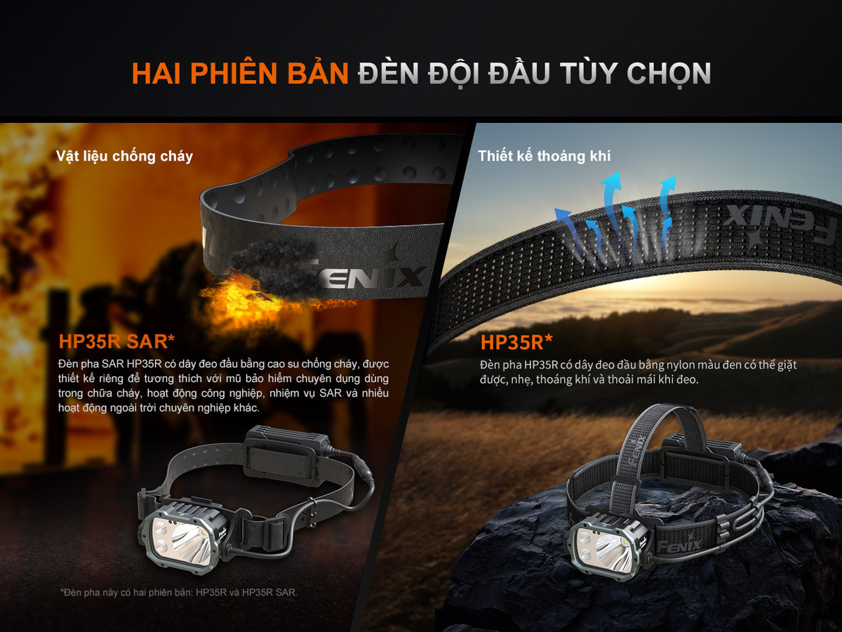 Fenix HP35R có 2 phiên bản gồm dây đeo co giãn và dây đeo chống cháy SAR. Vơi phiên bản SAR, dây đeo nhựa có khả năng chịu được nhiệt độ từ -20 đến 120 độ. Mount kết nối đèn cũng được thiết kế riêng để có thể gắn đèn lên các nón bảo hộ.