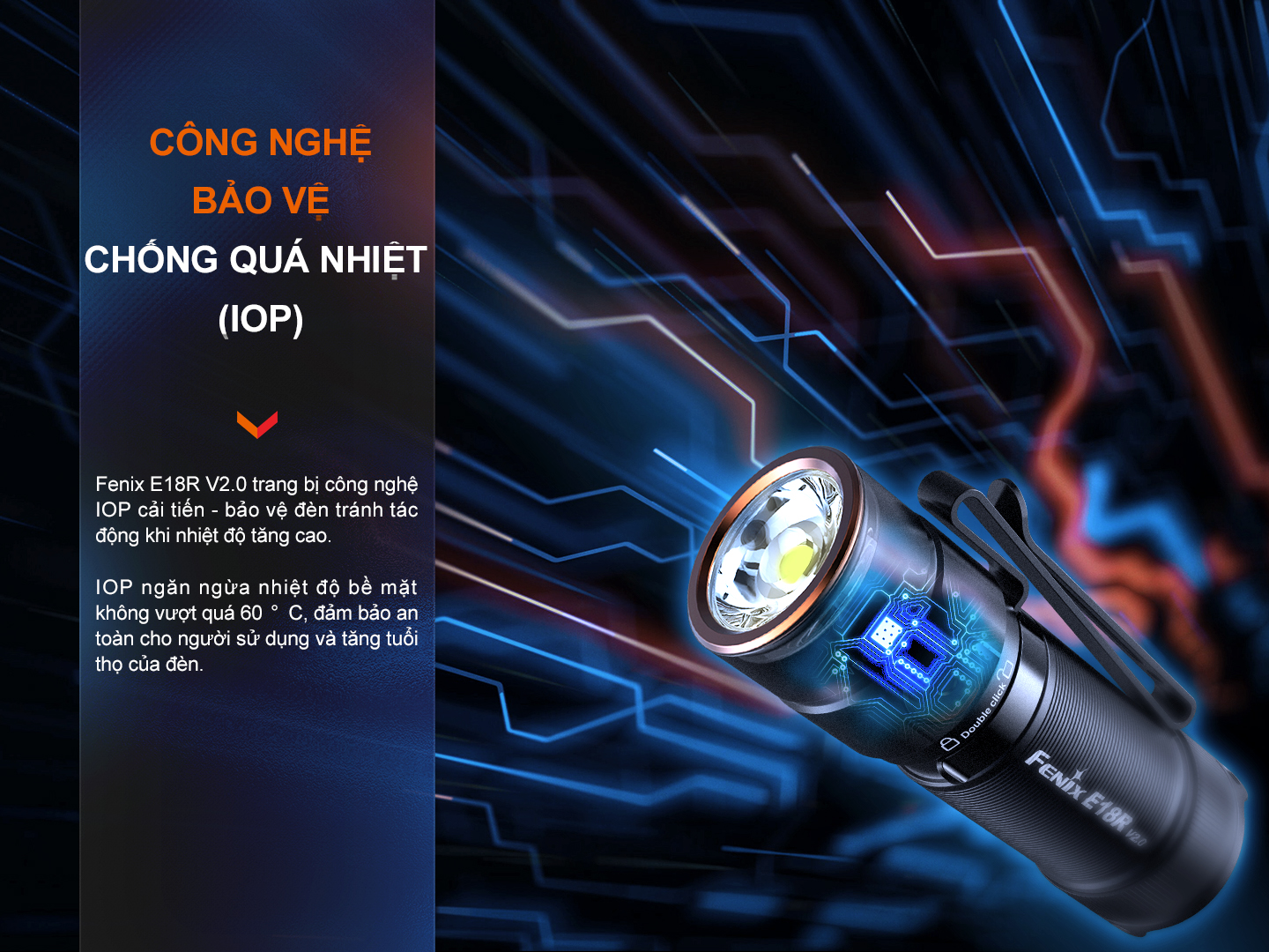 Fenix E18RV2.0 được trang bị nhiều tính năng thông minh như: kiểm soát nhiệt tự động, cảnh báo điện áp thấp và chức năng lưu nấc sáng lần cuối.
