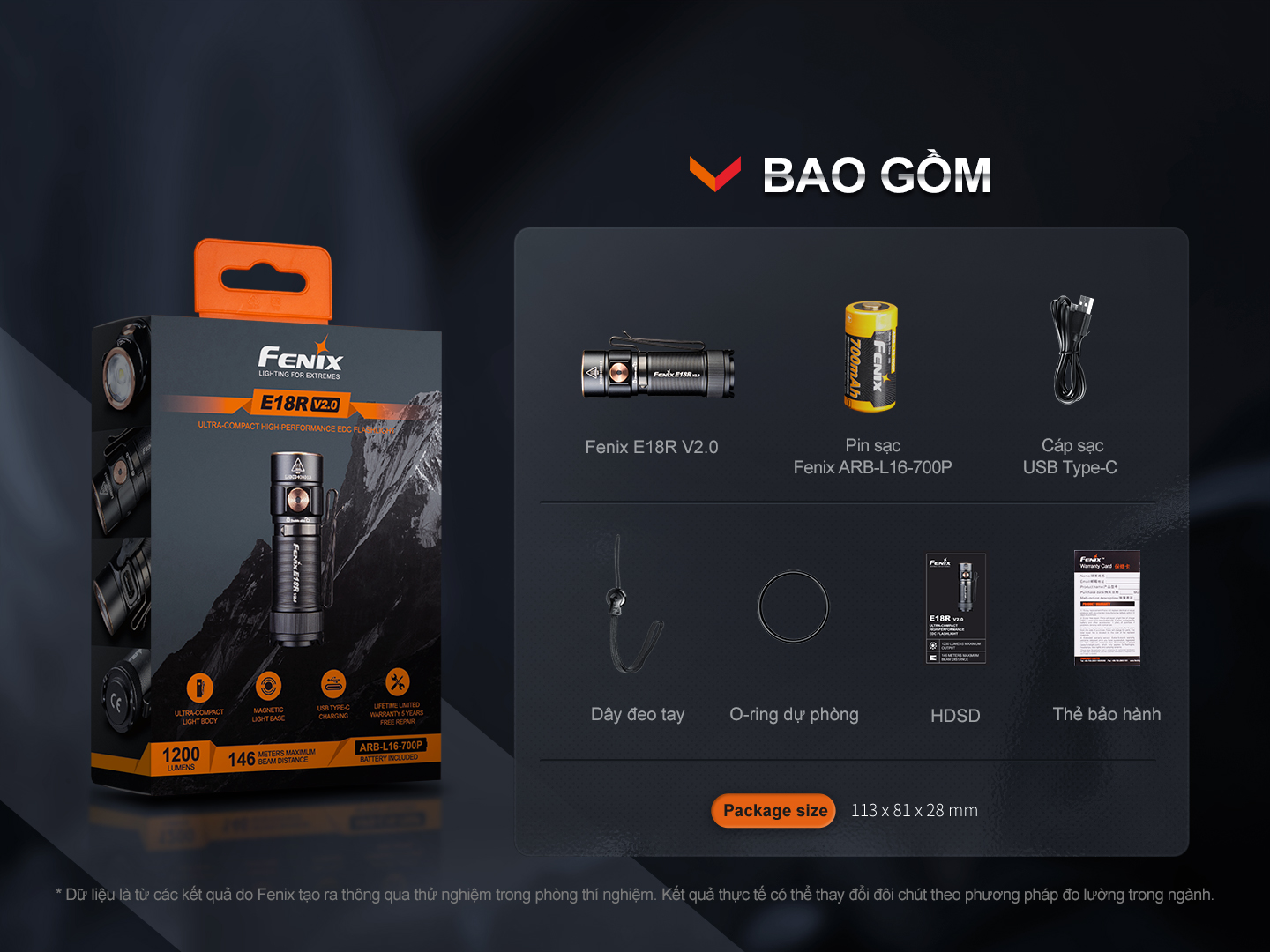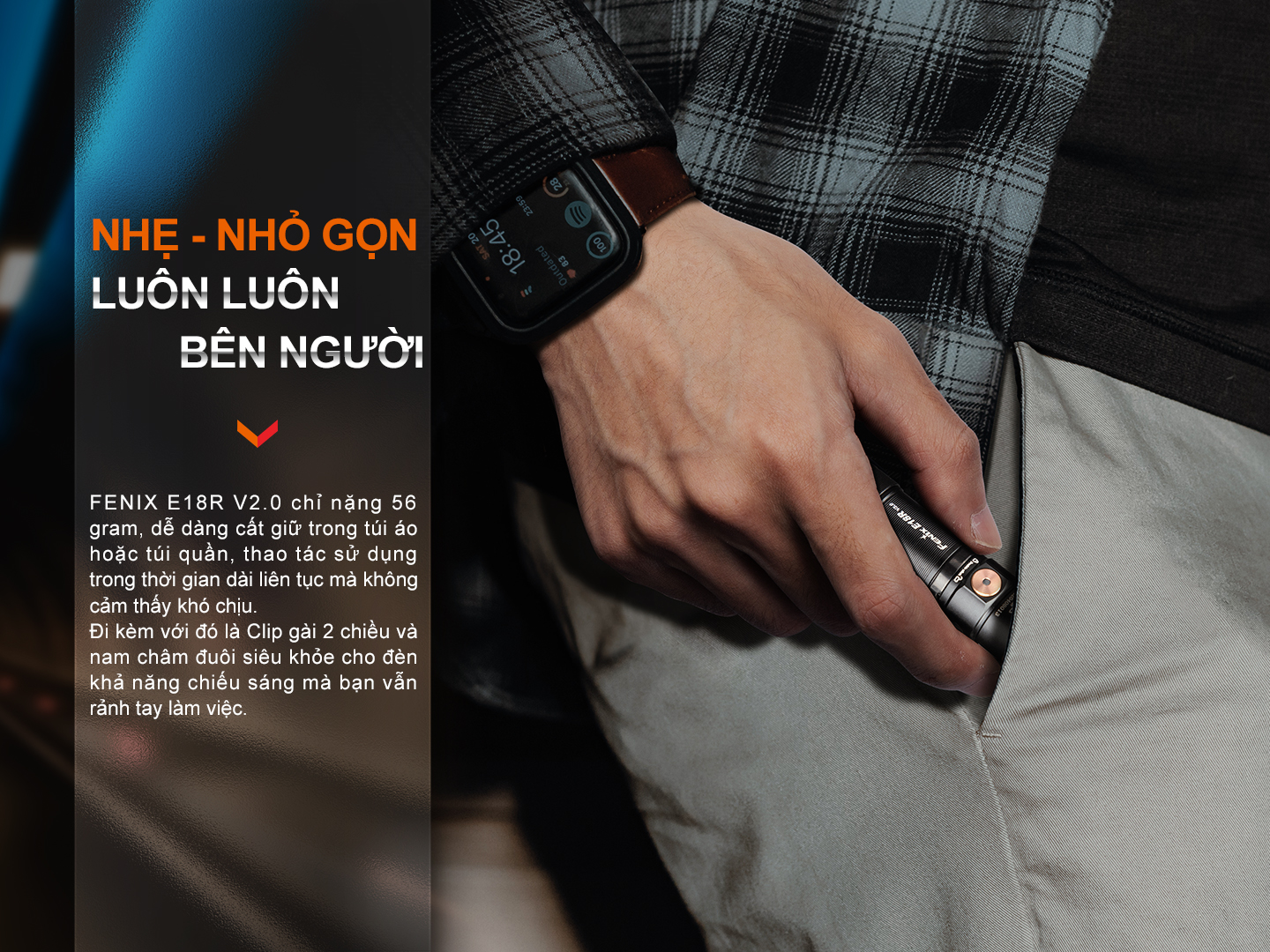 Đèn pin FENIX E18R V2.0 là đèn pin hiệu suất cao với thiết kế nhỏ gọn có kích thước chỉ bằng 2 ngón tay, dễ dàng bỏ túi mang theo hàng ngày. Với chùm tia sáng nhẹ nhàng, đèn có độ sáng tối đa 1200 lumens và tầm chiếu xa lên đến 146 m. Đèn pin Fenix E18RV2.0 là một là đèn EDC có thể dùng khi đi bộ đường dài, sử dụng tại nơi làm việc hoặc giữ nó trong trường hợp khẩn cấp.