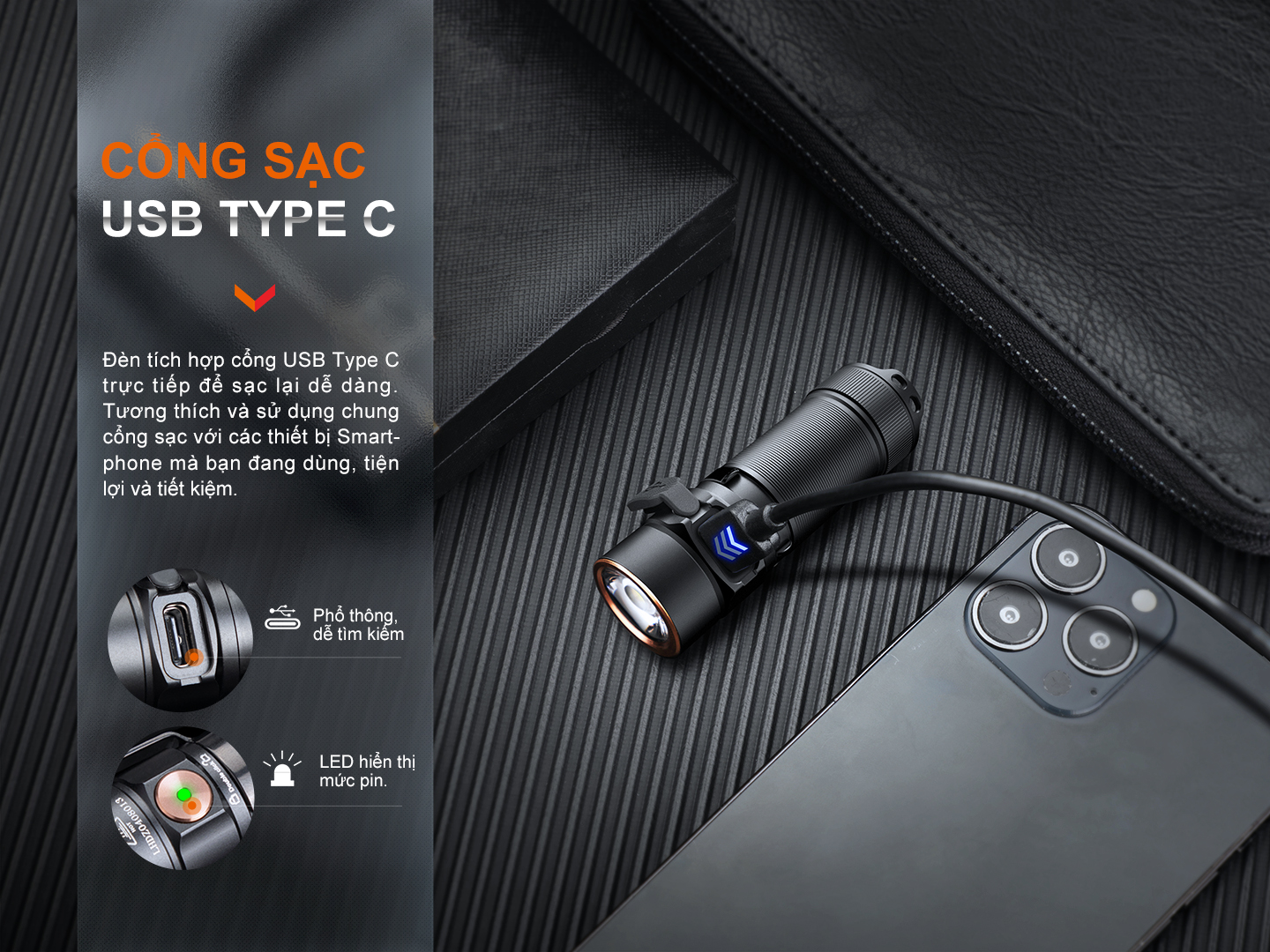 Cổng sạc USB-C, tốc độ sạc nhanh trong vòng 3 giờ, đèn có thể sáng liên tục 200 tiếng ở nấc sáng thấp nhất