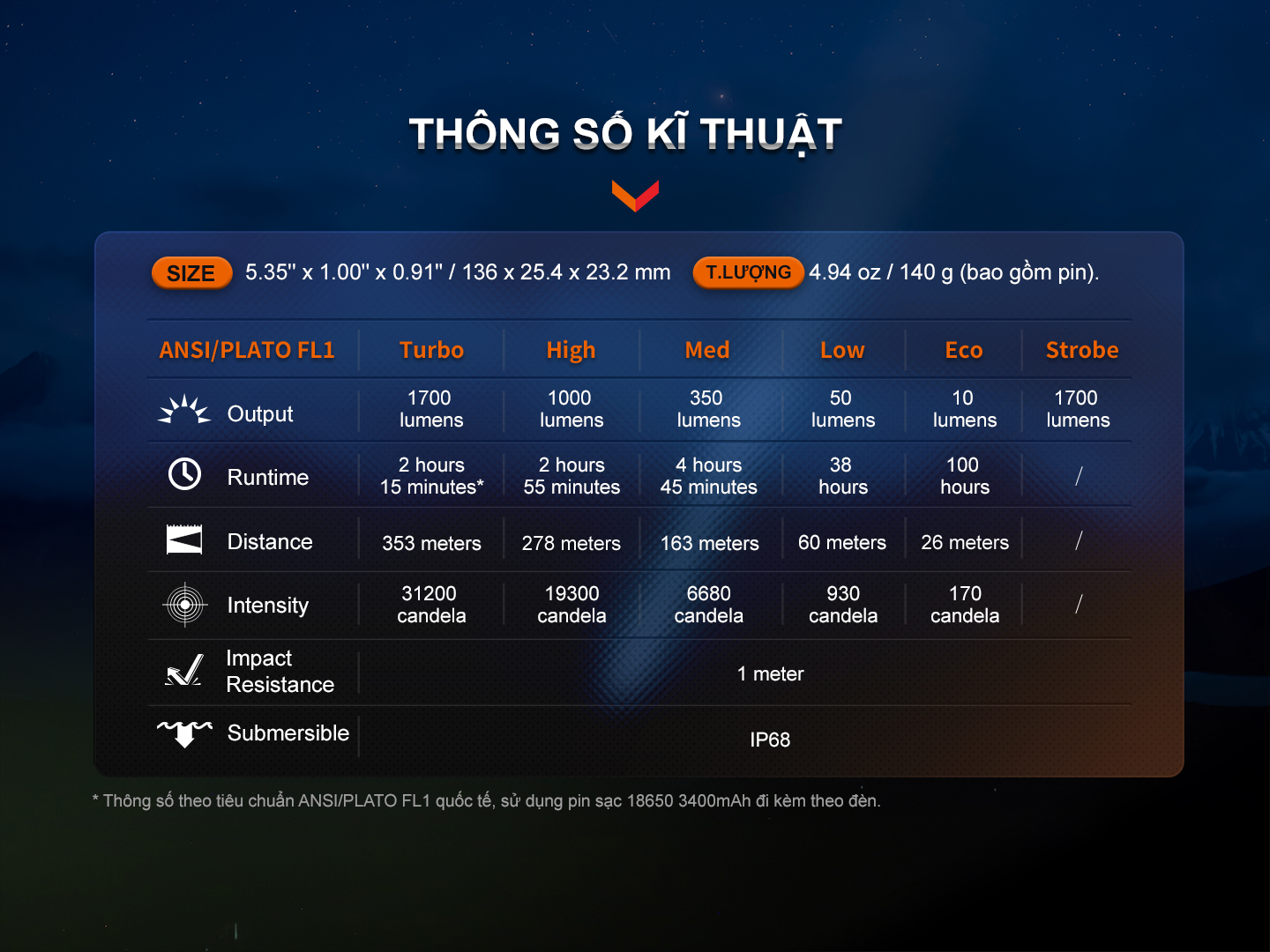 Tích hợp Công tắc kép chiến thuật độc quyền của FENIX – truy cập ngay lập tức mức “NHÁY” cảnh báo chỉ bằng một cú Click, và điều khiển thao tác các chế độ sáng chỉ bằng 1 tay.