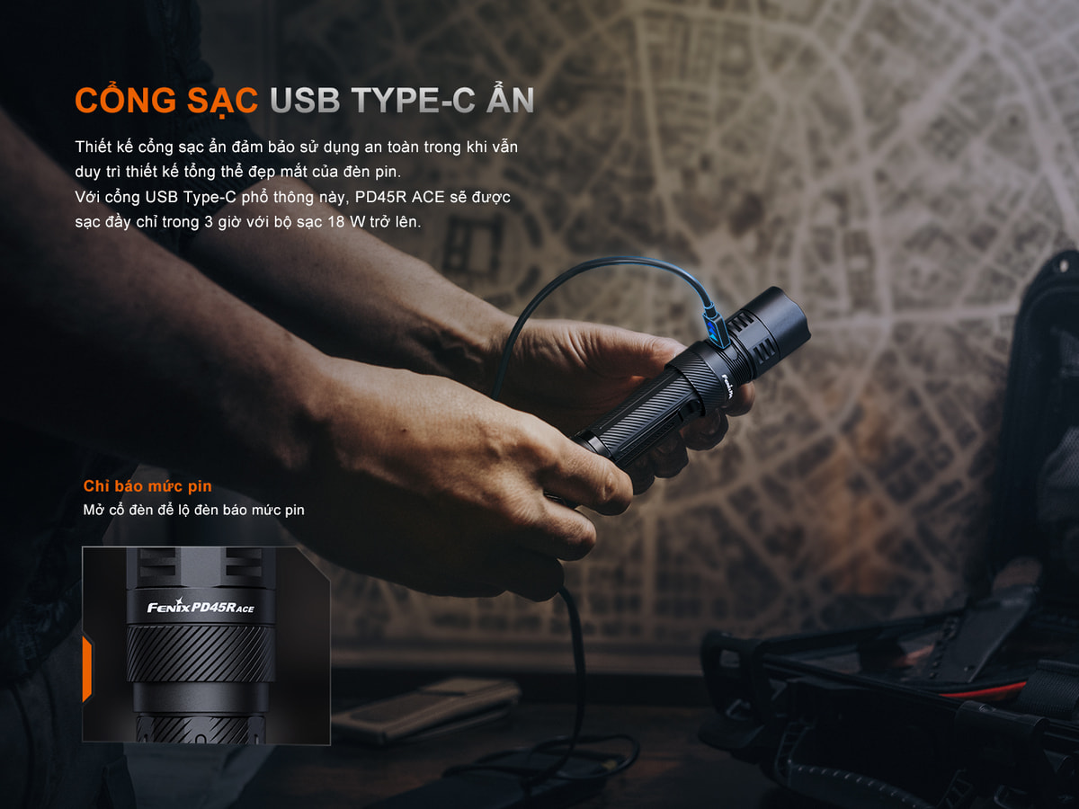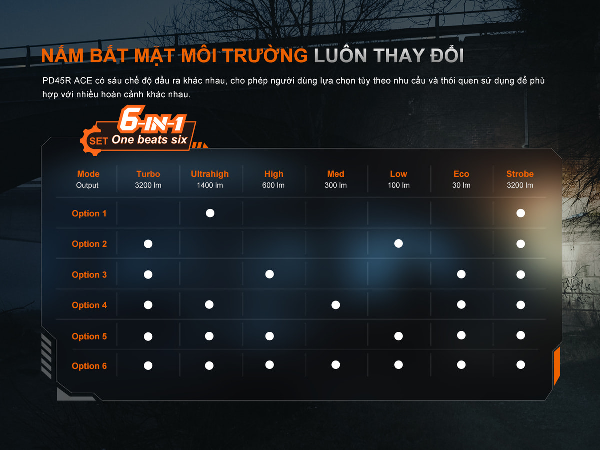 Fenix PD45R ACE là sự kết hợp hoàn hảo giữa hiệu suất chiếu sáng cực mạnh, cơ chế điều khiển tiện dụng và tính linh hoạt cao… đáp ứng cho nhiều tình huống sử dụng hàng ngày, các hoạt động ngoài trời và tuần tra, hỗ trợ cho lượng lượng hành pháp…