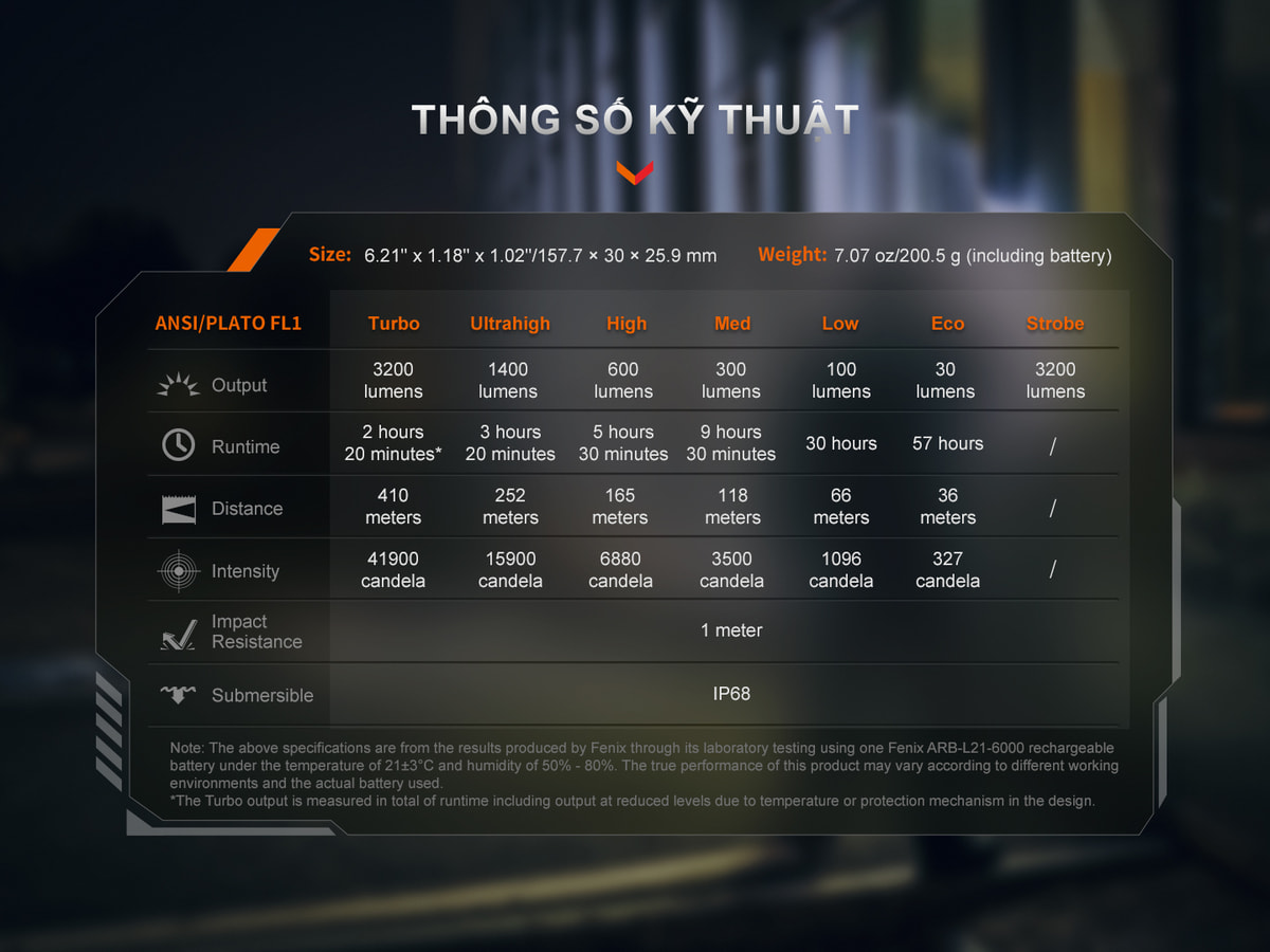 Đèn có công suất tối đa 3200 lumens, tầm chiếu xa đến 410 mét, đủ sức đáp ứng toàn bộ nhu cầu chiếu sáng cường độ cao đến sử dụng trong các nhiệm vụ cứu hộ, bảo vệ, kiểm tra kĩ thuật, tuần tra kho bãi.