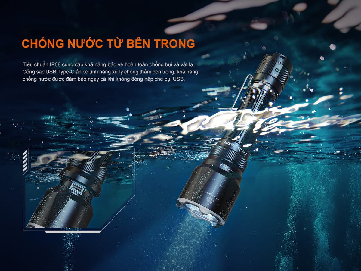 Fenix TK22R thừa hưởng thiết kế từ TK20R UE, vì vậy đèn có kích thước và cụm điều khiển giống nhau. Đèn cũng được trang bị cổng sạc Type C và nắp xoay che liền thân – tin cậy và kín khít gần như tuyệt đối, với thời gian sạc đầy chưa đến 4 giờ đồng hồ.