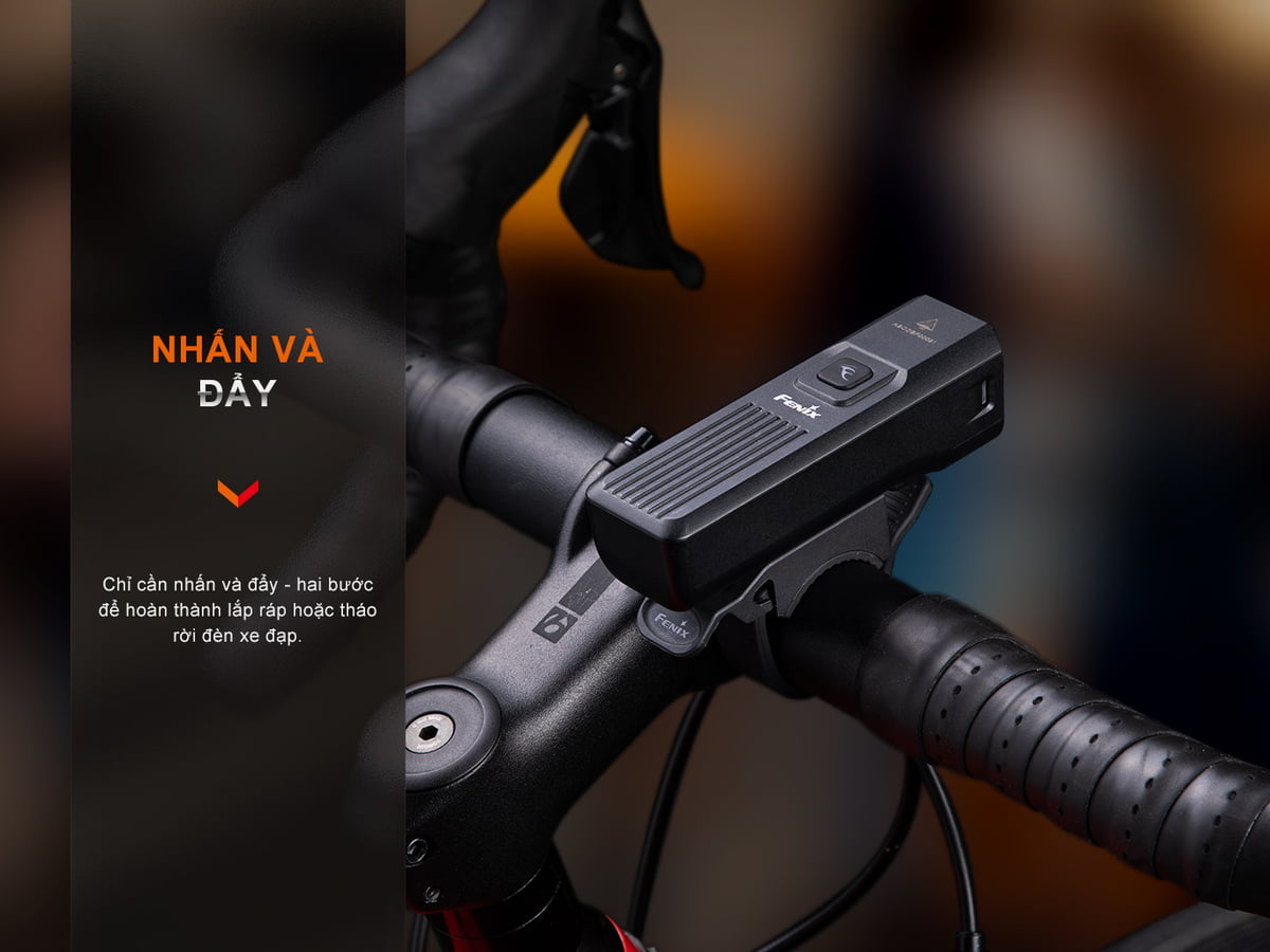 Đèn pin Fenix BC15R được kết nối với ghi đông xe bằng 1 Adaptor gài đi kèm. Tháo ráp cực kì nhanh chỉ với 2 bước: nhấn và đẩy. Nhờ vậy mà chúng ta có thể sử dụng BC15R như một chiếc đèn cầm tay sử dụng hàng ngày, không bị giới hạn chức năng hay rườm rà như các mẫu đèn xe đạp khác trên thị trường.