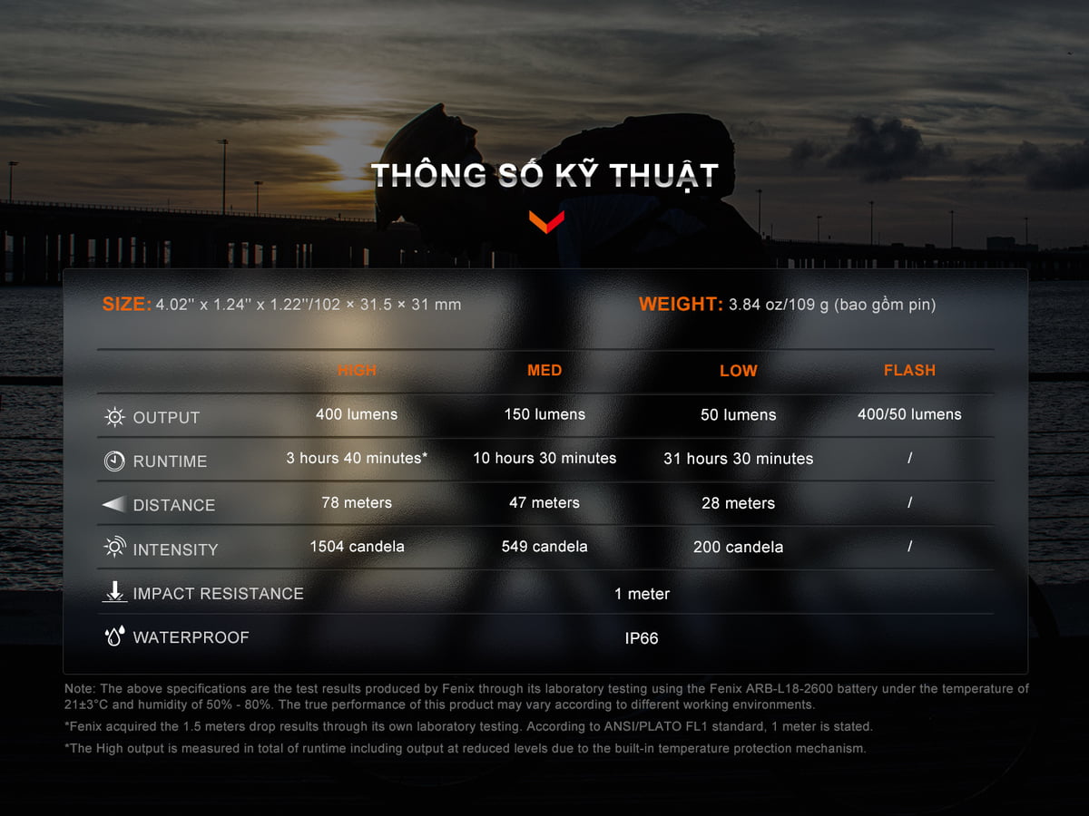 Fenix BC15R có công suất tối đa 400 lumens, tầm chiếu tối đa 78 mét, pin liền khối 2600mAh cho khả năng sáng liên tục hơn 31 giờ.